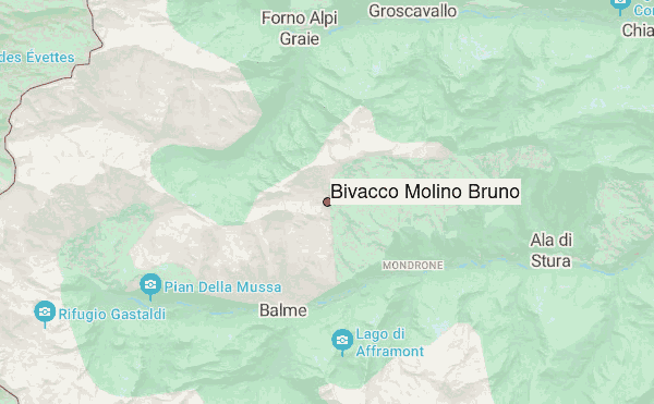 It stands at a panoramic spot beneath the north face of the Uia di Mondrone. Opened in 1987, the bivouac is dedicated to Bruno Molino, station master of the Balme Alpine Rescue. The structure is wooden, chalet-shaped, with a sheet metal roof.